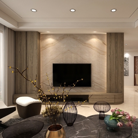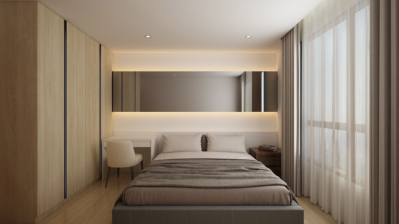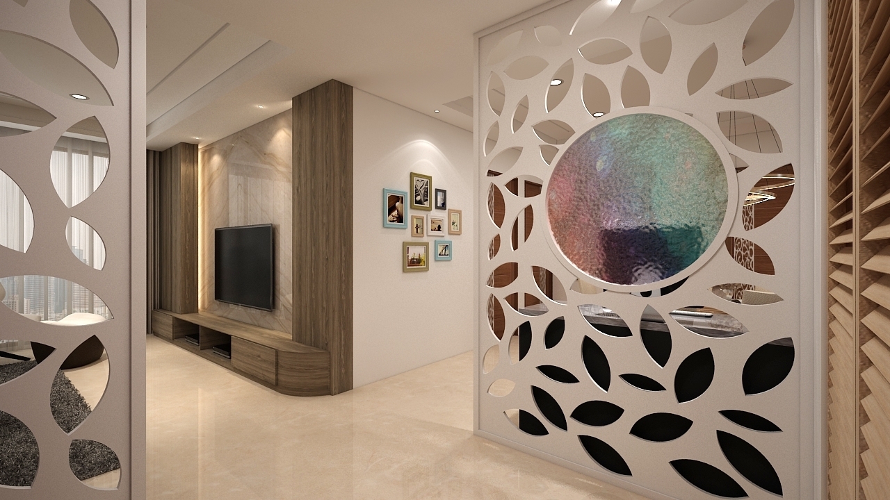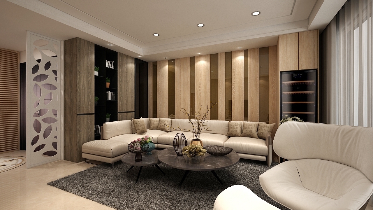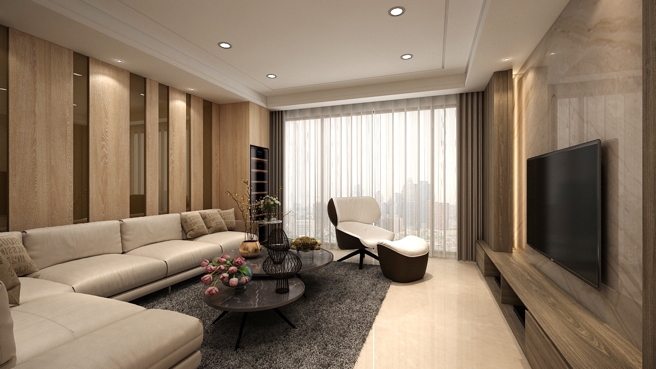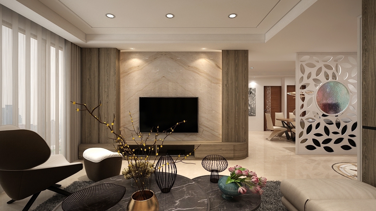 玄關和客廳、餐廳之間加上造型屏風隔斷,簡單的劃分出玄關空間,更有獨立感。 客廳以大理石材佐木元素,提升空間的溫度與格調。 鏡面搭配相對厚重的木質,稍許沉澱漂浮的視感,增添穩重內斂感。 餐廳空間利用吊燈及屏風的點綴,營造出優雅不纖弱低調但奢華的氛圍。 臥室以沉穩內斂、低調而不誇張的設計概念為基點。 在灰色,白色和大型方形窗戶的陪同下,鑲嵌在木板後的間接燈光讓臥室增添了現代感。