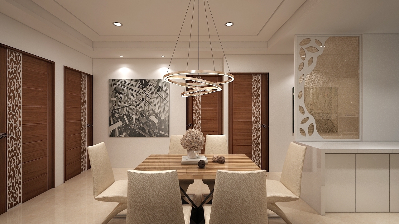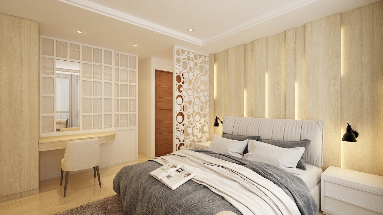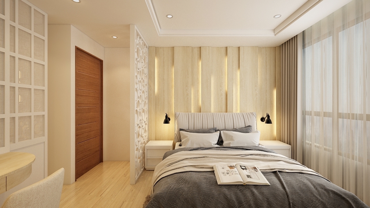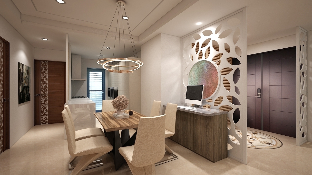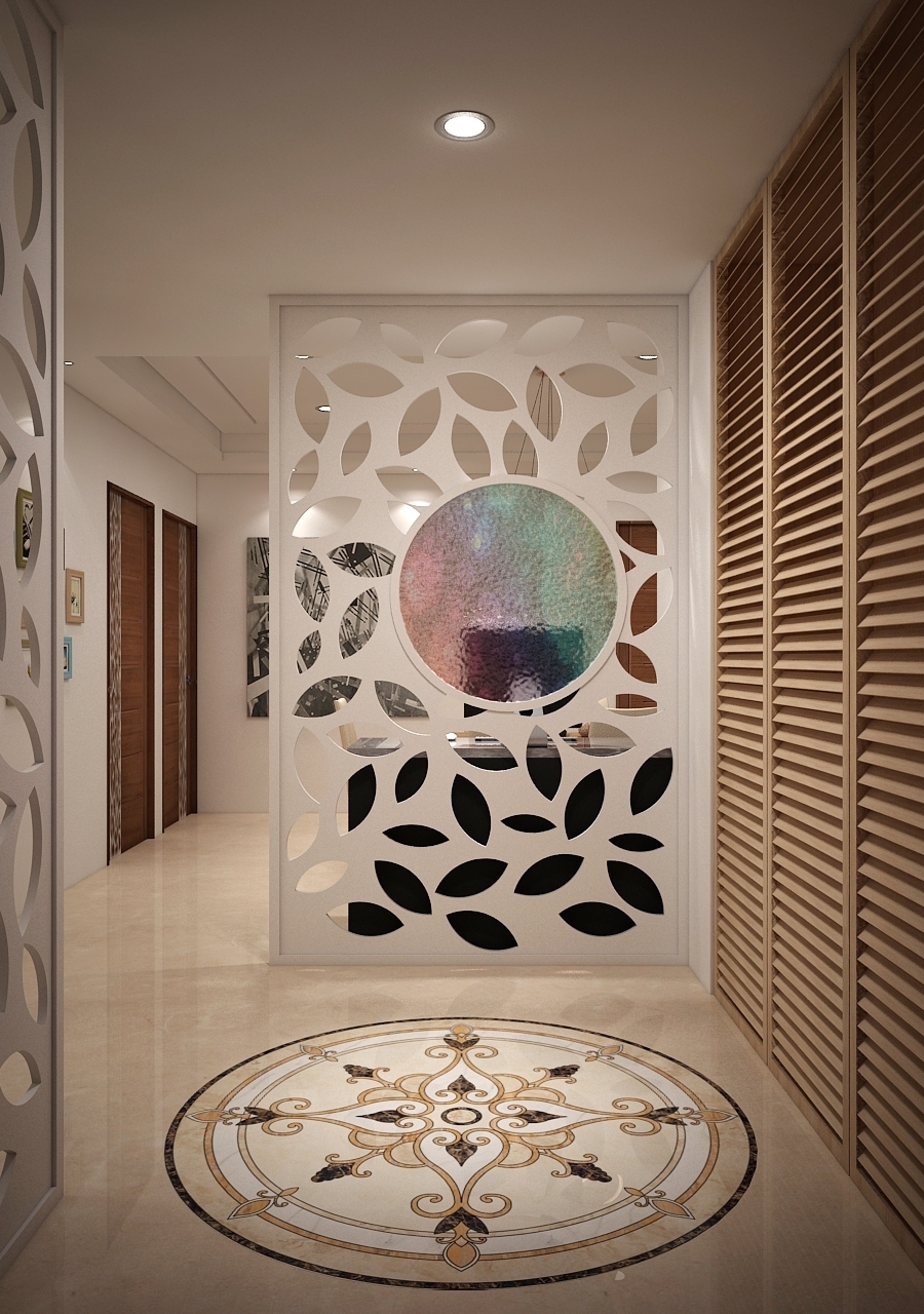 玄關和客廳、餐廳之間加上造型屏風隔斷,簡單的劃分出玄關空間,更有獨立感。 客廳以大理石材佐木元素,提升空間的溫度與格調。 鏡面搭配相對厚重的木質,稍許沉澱漂浮的視感,增添穩重內斂感。 餐廳空間利用吊燈及屏風的點綴,營造出優雅不纖弱低調但奢華的氛圍。 臥室以沉穩內斂、低調而不誇張的設計概念為基點。 在灰色,白色和大型方形窗戶的陪同下,鑲嵌在木板後的間接燈光讓臥室增添了現代感。